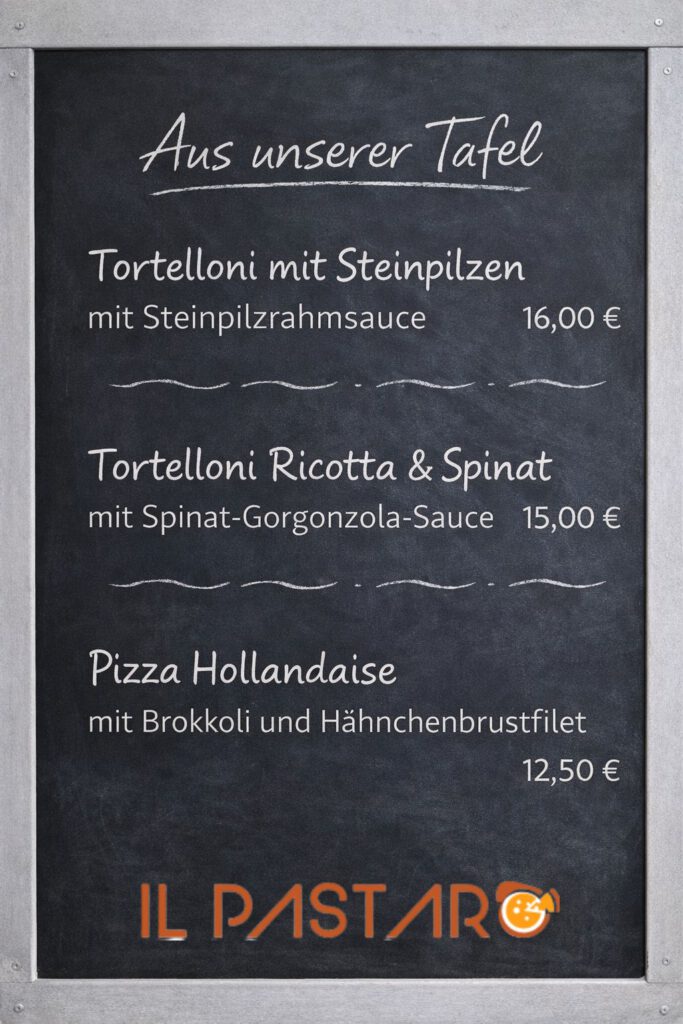 Feine Tortelloni mit Steinpilzfüllung, serviert in einer cremigen Steinpilzrahmsauce mit Cherry Tomaten Allergene: Gluten, Milch (Laktose), Ei mit Spinat-Gorgonzola-Sauce Allergene: Gluten, Milch (Laktose), Ei Pizza Hähnchen & Brokkoli mit Sauce Hollandaise Allergene: Gluten, Milch (Laktose), Ei , Sellerie , Senf01-Steinpilze TortelloniVACG